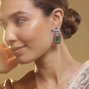 Oxidized Silver Plated Emerald, Ruby & Zirconia Studded Tiger Motif Statement Drop Earrings – Silver