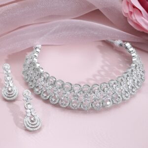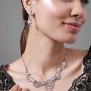 Rhodium Plated AD & Cubic Zirconia Studded Layered Statement Necklace Set – Silver