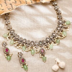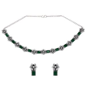 Oxidised Silver Plated Handcrafted Green Stone Floral Necklace Set – Silver