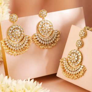 24K Gold Plated Kundan & Pearls Earrings & Maang Tikka Set – Gold