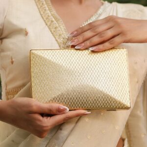 24K Gold Shimmery Glossy Box Clutch with Luxe Textured Finish & Chain – Cream