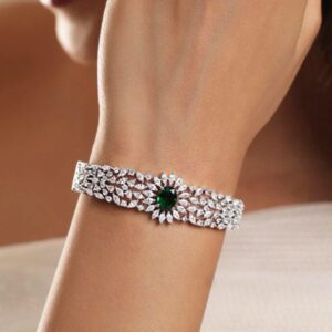 Rhodium-Plated Emerald Green & White Cubic Zirconia Studded Openable Bracelet – Silver::Green