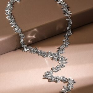 Rhodium Plated Leaf Motif Y Shaped Bold Statement Necklace – Silver