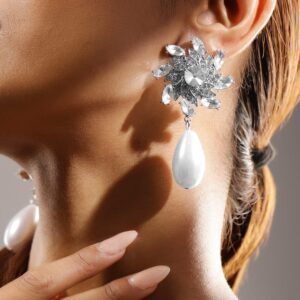 Rhodium-Plated Cubic Zirconia Studded Floral Earrings with White Pearl Drop – Silver