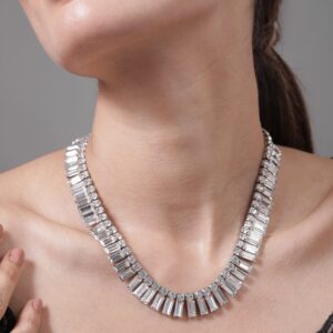 Rhodium Plated AD & Cubic Zirconia Studded Luxurious Baguette Necklace – Silver