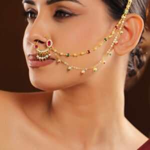 18K Gold-Plated Ruby Kundan Studded Multi-Colour Pearl Bead Triple-Layer Chain Nath Nosepin