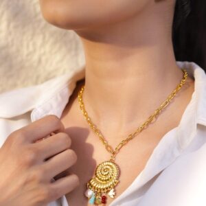 18K Gold-Plated Spiral Shell Pendant Necklace with Multi-Coloured Beads & Charms Brass Chain