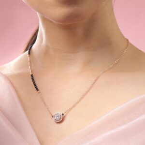 18K Rose Gold-Plated White Cubic Zirconia Studded Round Pendant Mangalsutra with Black Beaded Chain