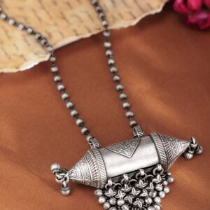 Oxidized Silver Plated Embossed Statement Pendant & ghungroo detail Long Necklace – Silver