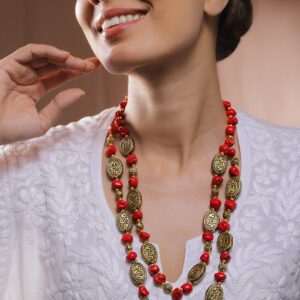 Oxidised Antique Gold-Plated Dual-Layer Necklace with Red Carved Beads & Tribal Oval Discs – Red
