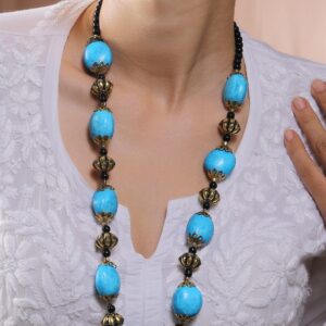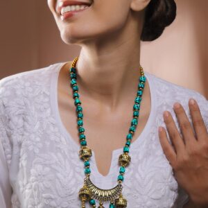 Oxidized Silver-Plated Tribal Pendant Necklace with Turquoise Blue Beads & Dome Charms – Turquoise Blue