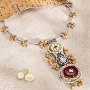 Oxidized Silver & Gold Plated Ruby Red & White Cubic Zirconia Studded Statement Necklace with Golden Beads