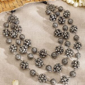Oxidized Silver-Plated Triple-Layered Floral Bead Statement Necklace for Women – Silver