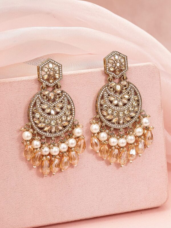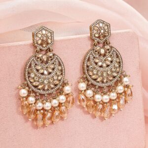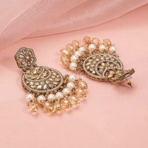 Exquisite 18K gold-plated kundan chandbali earrings adorned with sky blue stones and complemented by matching sky blue and light golden beads. A timeless piece to elevate any traditional attire. Material & Care Length : 10 cm ; Width : 4 cm Material : Brass Care Label : It is advisable to avoid contact with water and organic chemicals i.e. perfume sprays. Store jewellery in airtight box. After use, wipe the jewellery with soft cotton cloth.