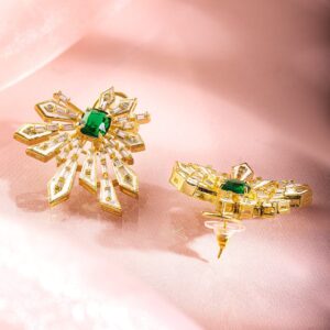 Earrings : These 18K gold-plated statement stud earrings feature a striking emerald green stone at the center, with sparkling cubic zirconia accents for a glamorous, bold look perfect for any occasion. Occasion : Bring your style to a whole new level with this handcrafted piece of jewellery. When you’re celebrating a special Occasion : – a birthday, wedding, or personal milestone – this piece adds that extra something that makes us feel special and looking our best. Material : & Care Dimension : Length : 4CM, Width: 3.5CM Material: Alloy Net Weight: 10 Gram Net Quantity: 1 Pair of Earrings Care Label: It is advisable to avoid contact with water and organic chemicals i.e. perfume sprays. Store jewellery in airtight box. After use, wipe the jewellery with soft cotton cloth.