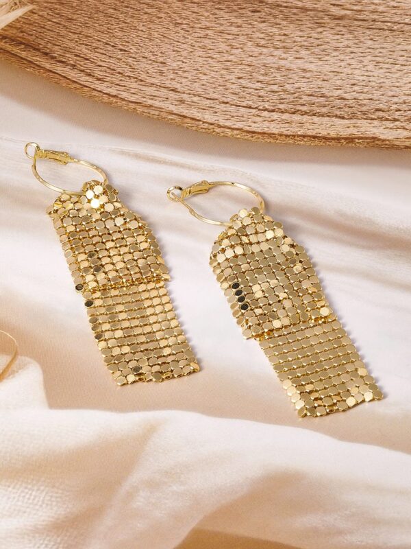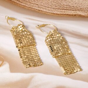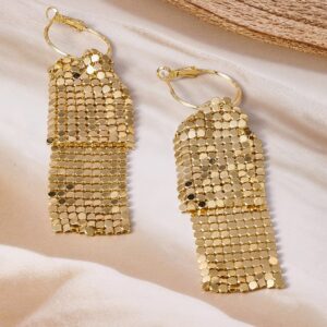 Earrings : These 18K gold plated mesh dangle earrings feature a shimmering design with small reflective discs that create a dazzling effect. The retro disco-inspired style is enhanced with a hoop closure, adding a touch of vintage glamour to any outfit. Perfect for those who love bold and eye-catching accessories. Occasion : Bring your style to a whole new level with this handcrafted piece of jewellery. When you’re celebrating a special Occasion : – a birthday, wedding, or personal milestone – this piece adds that extra something that makes us feel special and looking our best. Material : & Care Dimension : Size : Length : 10 cm, Width : 2.3 cm Material :Brass Care Label : It is advisable to avoid contact with water and organic chemicals i.e. perfume sprays. Store jewellery in airtight box. After use, wipe the jewellery with soft cotton cloth.