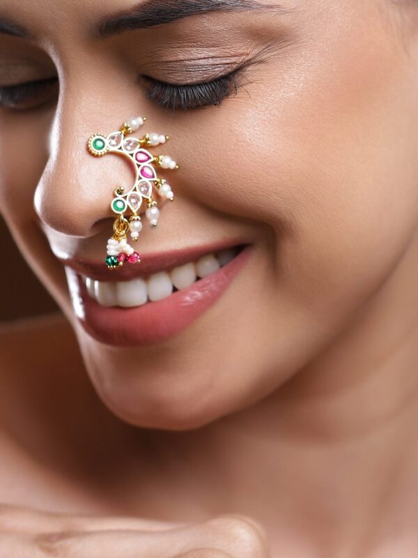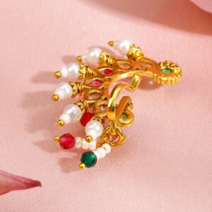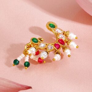 This 22K gold-plated crescent nath features ruby pink, emerald green, and white stones with pearl detailing and colourful bead drops—designed in a non-pierced clip-on style for effortless ethnic elegance. Cultural Grace & Gifting: A symbolic and stylish gift for brides or festive celebrations. This floral Nath brings timeless cultural grace to every traditional jewellery collection. Material & Care Dimension: Length: 4 cm ; Width: 2 cm Material: Brass Net Weight: 3.28 Gram Net Quantity: 1 Nath Nosepin Care Label: It is advisable to avoid contact with water and organic chemicals i.e. perfume sprays. Store jewellery in airtight box. After use, wipe the jewellery with soft cotton cloth.