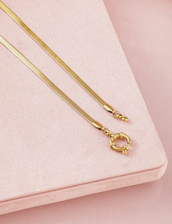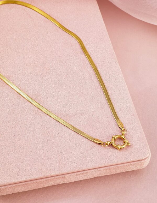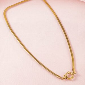 This elegant 18K gold-plated chain necklace is crafted from premium stainless steel, ensuring it is tarnish-free and waterproof. Its sleek and minimalistic design makes it a versatile piece that can be worn alone or layered with other necklaces. The demi-fine quality adds a touch of sophistication, making it a perfect addition to any jewelry collection. Material: Wipe with a clean, dry cloth to remove dust Size : Length : 20 cm, Width : 1 cm