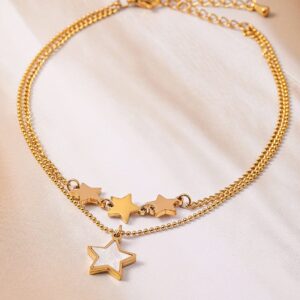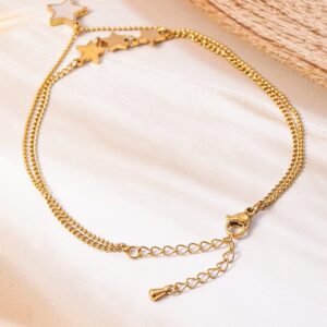 Anklet : This charming anklet features a playful arrangement of star charms, crafted in 18K gold-plated stainless steel. Designed to be tarnish-free and waterproof, this anklet adds a touch of celestial elegance to any ensemble, making it a versatile and stylish accessory. Occasion : Bring your style to a whole new level with this handcrafted piece of jewellery. When you’re celebrating a special Occasion : – a birthday, wedding, or personal milestone – this piece adds that extra something that makes us feel special and looking our best. Material : & Care Dimension : Size : Length : 22 cm, Width : 1.2 cm Material :Stainless Steel Care Label : It is advisable to avoid contact with water and organic chemicals i.e. perfume sprays. Store jewellery in airtight box. After use, wipe the jewellery with soft cotton cloth.