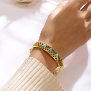 Bracelet : A stunning filigree bracelet in 18K gold plating, studded with oval-cut blue stones, crafted from stainless steel for a tarnish-free, waterproof, and long-lasting shine. Occasion : Bring your style to a whole new level with this handcrafted piece of jewellery. When you’re celebrating a special Occasion : – a birthday, wedding, or personal milestone – this piece adds that extra something that makes us feel special and looking our best. Material : & Care Dimension : Length : 6 cm, Width: 1.1 cm Net Weight: 27.2g Net Quantity : 1 Bracelet Material :Stainless steel Care Label : It is advisable to avoid contact with water and organic chemicals i.e. perfume sprays. Store jewellery in airtight box. After use, wipe the jewellery with soft cotton cloth.