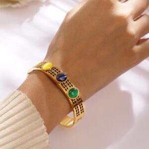 Bracelet : This bold 18K gold-plated stainless steel bangle bracelet features vibrant yellow, black, and green gemstones in a modern cutout lattice design, offering a luxurious and waterproof demi-fine finish. Occasion : Bring your style to a whole new level with this handcrafted piece of jewellery. When you’re celebrating a special Occasion : – a birthday, wedding, or personal milestone – this piece adds that extra something that makes us feel special and looking our best. Material : & Care Dimension : Length : 6 cm, Width: 1 cm Net Weight: 36.2 g Net Quantity : 1 Bracelet Material :Stainless steel Care Label : It is advisable to avoid contact with water and organic chemicals i.e. perfume sprays. Store jewellery in airtight box. After use, wipe the jewellery with soft cotton cloth.