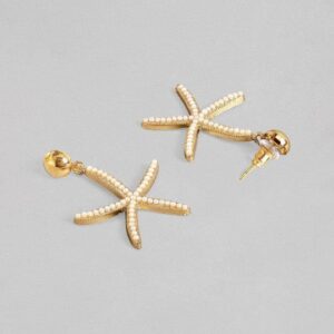 These 18K gold-plated drop earrings from feature a starfish design with intricate pearl beadwork, offering a chic and whimsical touch. Perfect for elevating your look with elegance. Material & Care Dimension : Length : 4 cm ; Width : 4.5 cm Material : Brass Care Label : It is advisable to avoid contact with water and organic chemicals i.e. perfume sprays. Store jewellery in airtight box. After use, wipe the jewellery with soft cotton cloth.