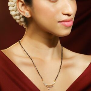 Be the first to review “18K Gold-Plated White Cubic Zirconia Studded Crescent Moon Mangalsutra Set with Black Beaded Chain & Floral Earrings – Gold”