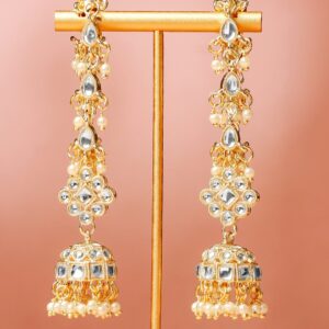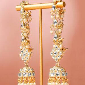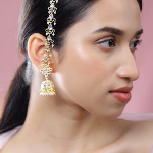 Handcrafted in 18K gold plating, this long earring extension features white kundan stones and delicate ruby pink & glossy white pearl beading. A perfect add-on for bridal and festive looks. Occasion : Bring your style to a whole new level with this handcrafted piece of jewellery. When you’re celebrating a special Occasion : – a birthday, wedding, festive or personal milestone – this piece adds that extra something that makes us feel special and looking our best. Material & Care Dimension : Earrings – Length : 15 cm, Width : 2 cm, Material : Brass Net Weight : 32 Gram Net qnty : 1 pair of Jhumka Ear Chain Care Label : It is advisable to avoid contact with water and organic chemicals i.e. perfume sprays. Store jewellery in airtight box. After use, wipe the jewellery with soft cotton cloth.