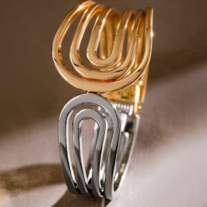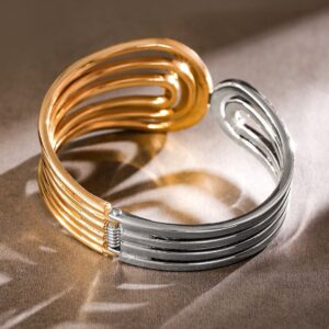 Bracelet : Elevate your style with this contemporary dual-tone open cuff bracelet. Designed with sleek, fluid lines in both gold and silver finishes, this statement piece exudes elegance and modern charm. The open-ended design allows for an adjustable fit, making it a versatile accessory for any occasion. Whether paired with casual or formal attire, this bracelet adds a sophisticated touch to your jewelry collection. Versatile Styling: Perfect for party, festive, or daily wear, complementing both western and ethnic ensembles with equal flair. Material : & Care Dimension : Length : 6.5 cm, Width: 3 cm Net Weight: 22.83 g Net Quantity : 1 Bracelet Material : Brass Care Label : It is advisable to avoid contact with water and organic chemicals i.e. perfume sprays. Store jewellery in airtight box. After use, wipe the jewellery with soft cotton cloth.