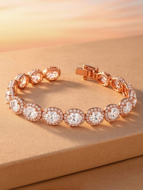 Bracelet :An exquisite 18K rose gold-plated bracelet featuring oval-cut AAA cubic zirconia stones in a classic halo setting. This premium bracelet adds a touch of luxury and brilliance, perfect for special occasions and elegant styling. Occasion : Bring your style to a whole new level with this handcrafted piece of jewellery. When you’re celebrating a special Occasion : – a birthday, wedding, or personal milestone – this piece adds that extra something that makes us feel special and looking our best. Material : & Care Dimension : Length : 18 cm, Width: 0.8 cm Net Weight: 14.65g Net Quantity : 1 Bracelet Material :Brass Care Label : It is advisable to avoid contact with water and organic chemicals i.e. perfume sprays. Store jewellery in airtight box. After use, wipe the jewellery with soft cotton cloth.