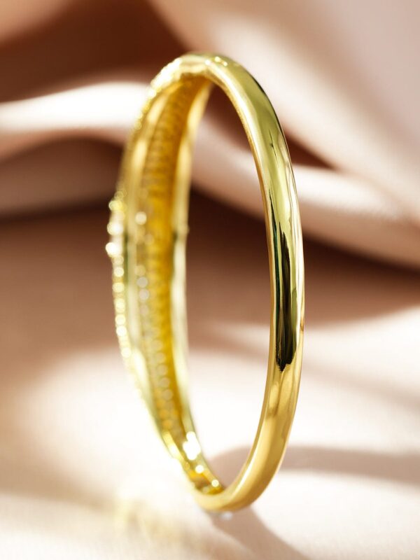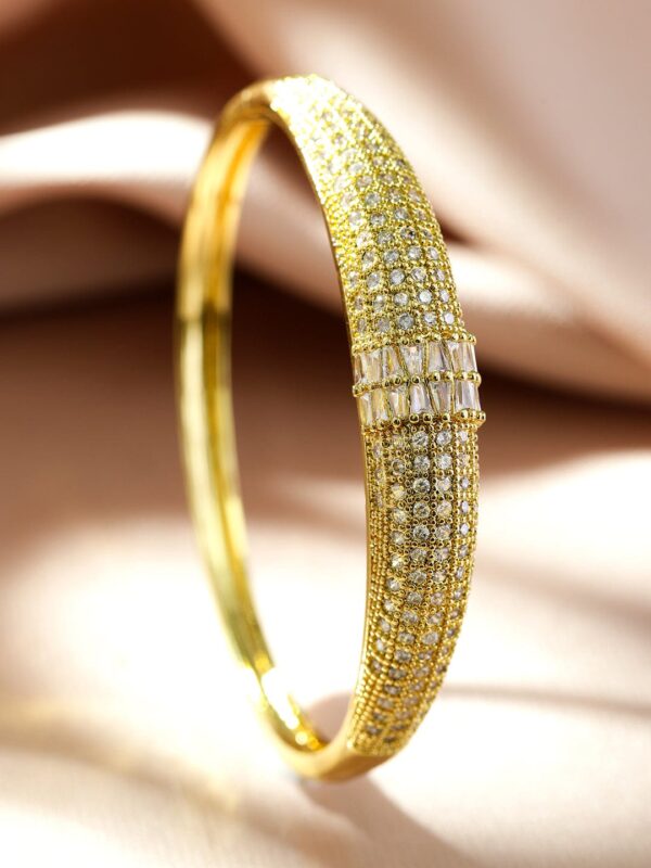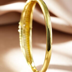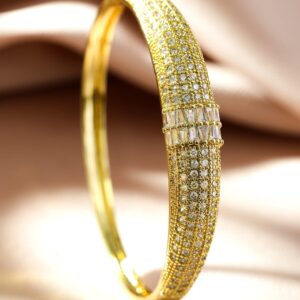 Bracelet : Elevate your elegance with the 22K gold-plated Openable Bracelet studded with sparkling white cubic zirconia stones. A timeless piece blending luxurious design with contemporary finesse. Occasion : Bring your style to a whole new level with this handcrafted piece of jewelry. When you’re celebrating a special Occasion : – a birthday, wedding, festive, parties or personal milestone – this piece adds that extra something that makes us feel special and looking our best. Material & Care Dimension : Size : Length : 6.5 cm ; Width : 1 cm Material :Brass Net Weight: 22.70 Gram Net Quantity: 1 Bracelet Type : Openable Bracelet Care Label : It is advisable to avoid contact with water and organic chemicals i.e. perfume sprays. Store jewellery in airtight box. After use, wipe the jewellery with soft cotton cloth.