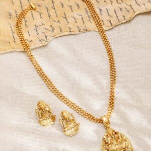 Jewellery Set : This 22K gold-plated necklace set features a divine Ganesh motif pendant with a textured chain and matching earrings, making it a statement of elegance and spirituality. Occasion : Bring your style to a whole new level with this handcrafted piece of jewellery. When you’re celebrating a special Occasion : – a birthday, wedding, or personal milestone – this piece adds that extra something that makes us feel special and looking our best. Material : & Care Dimension : Length : 24.5 cm / 5.8 cm, Width: 2.9 cm / 2 cm Net Weight: 36.15 g Net Quantity : 1 Necklace & 2 Earrings Material :Brass Care Label : It is advisable to avoid contact with water and organic chemicals i.e. perfume sprays. Store jewellery in airtight box. After use, wipe the jewellery with soft cotton cloth.