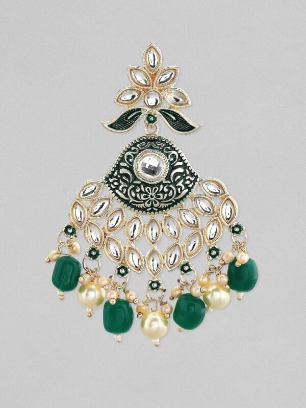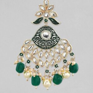 Earrings : Elevate your ethnic ensemble with these exquisite gold-plated Chandelier earrings. Adorned with stunning green and white beads, these earrings feature intricate Kundan stud detailing that adds a regal touch. The elegant floral design is complemented by the charming beaded tassels, making these earrings perfect for adding a hint of luxury to your traditional attire. Ideal for women who appreciate a blend of classic and contemporary styles, these earrings are a beautiful addition to your jewelry collection. Occasion : Bring your style to a whole new level with this handcrafted piece of jewellery. When you’re celebrating a special Occasion : – a birthday, wedding, or personal milestone – this piece adds that extra something that makes us feel special and looking our best. Material : & Care Dimension : Size: Length : 8 cm, Width : 4 cm Material :Alloy Net Weight: 40 Gram Net Quantity: 1 Pair of Earrings Care Label: It is advisable to avoid contact with water and organic chemicals i.e. perfume sprays. Store jewellery in airtight box. After use, wipe the jewellery with soft cotton cloth.