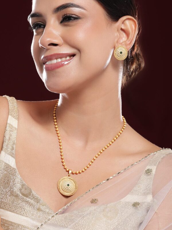 Jewellery Set: This 22K gold-plated traditional jewellery set features an intricately designed pendant and matching earrings, accented with a green stone. Perfect for adding elegance to your cultural attire. Occasion : Bring your style to a whole new level with this handcrafted piece of jewellery. When you’re celebrating a special Occasion : – a birthday, wedding, or personal milestone – this piece adds that extra something that makes us feel special and looking our best. Material : & Care Dimension : Length : 35 cm/ 1 cm Width : 3.5 cm / 1 cm Material: Brass Net Weight: 25 Gram Net Quantity: 1 Necklace & 1 Pair of Earrings Care Label: It is advisable to avoid contact with water and organic chemicals i.e. perfume sprays. Store jewellery in airtight box. After use, wipe the jewellery with soft cotton cloth.