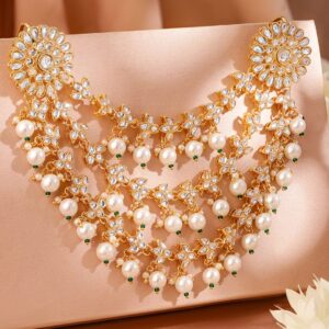 Be the first to review “22K Gold-Plated Kundan & Pearl Beads Multilayer Floral Hair Accessory with Stone Detailing”