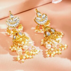 Jewellery Set : This 22K gold-plated necklace set features kundan-studded pendant, multi-strand white pearl layers, and gold-toned beads with matching jhumkas—ideal for women & girls for festive and wedding looks. Occasion : Bring your style to a whole new level with this handcrafted piece of jewelry. When you’re celebrating a weddings, festive occasions & traditional ceremonies, this piece adds that extra something that makes us feel special and looking our best. Material & Care Dimension : Length Size : Necklace : 34 cm, Earrings : 7 cm Dimension : Width : Necklace : 7 cm, Earrings : 1.8 cm Net Quantity : 1 Necklace & 1 Pair of Earrings Net Weight: 48.42 Gram Material : Brass Care Label : It is advisable to avoid contact with water and organic chemicals i.e. perfume sprays. Store jewellery in airtight box. After use, wipe the jewellery with soft cotton cloth.