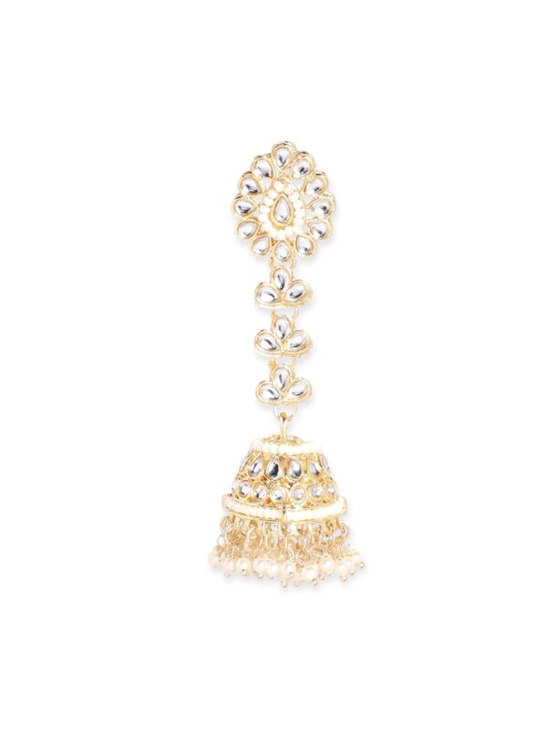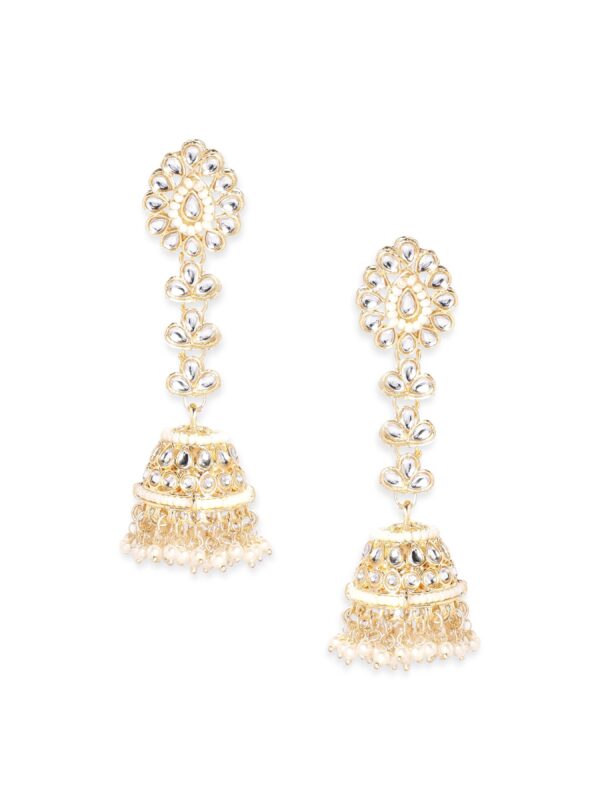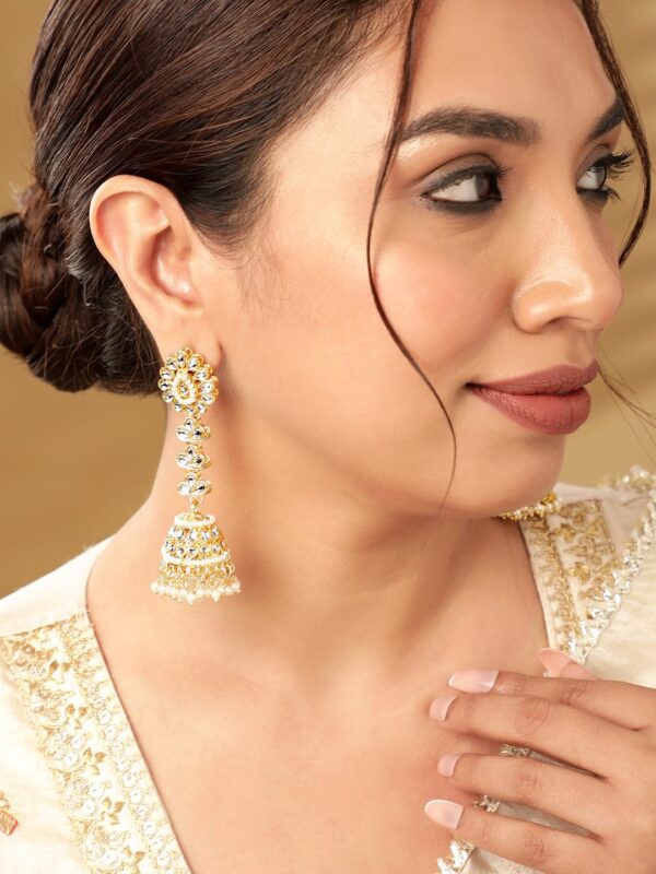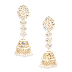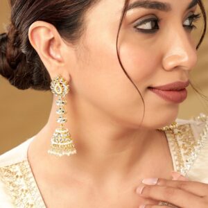 Adorn yourself in timeless elegance with our 22K Gold-Plated Kundan Studded Pearl Beaded Elegant Jhumka Earrings. These exquisite earrings showcase intricate Kundan detailing and lustrous pearl beads, offering a perfect blend of sophistication and traditional charm for a stunning accessory. Material : & Care Dimension : Length 8.5 cm; Width 2 cm: Material : Brass Weight : 39.82g Net Qnty : 1 Pair Earrings Care Label : It is advisable to avoid contact with water and organic chemicals i.e. perfume sprays. Store jewellery in airtight box. After use, wipe the jewellery with soft cotton cloth.