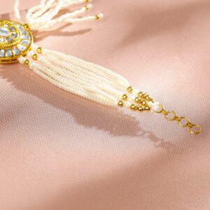 Bracelet : This 22K gold-plated statement bracelet features a stunning circular Kundan-studded centerpiece with delicate pearl bead strands and an elegant tassel detail. The intricate craftsmanship and traditional design make it a perfect accessory for weddings and festive occasions. Occasion : Bring your style to a whole new level with this handcrafted piece of jewellery. When you’re celebrating a special Occasion : – a birthday, wedding, or personal milestone – this piece adds that extra something that makes us feel special and looking our best. Material : & Care Dimension : Length : 16 cm, Width: 2.5 cm Net Weight: 15.65 g Net Quantity : 1 Bracelet Material :Brass Care Label : It is advisable to avoid contact with water and organic chemicals i.e. perfume sprays. Store jewellery in airtight box. After use, wipe the jewellery with soft cotton cloth.