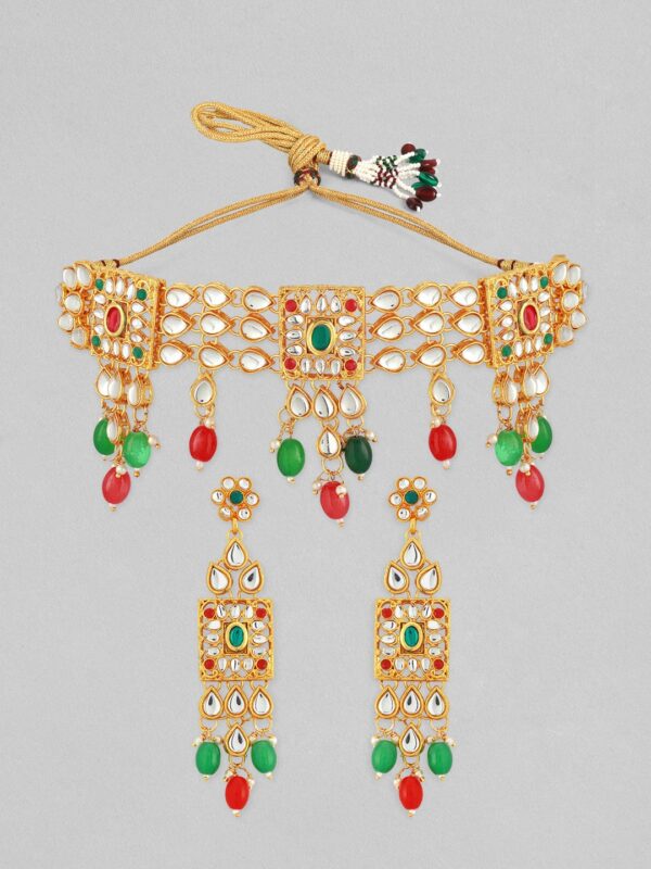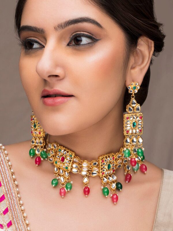 Necklace Set : Embrace the vibrant hues of tradition with this 22K Gold-Plated Choker Set. The choker is adorned with a striking combination of red, green, and white beads, accentuated by intricate kundan work. The multicolor stones and gold-plated design create a captivating piece that perfectly balances elegance and opulence. Paired with matching earrings, this set is ideal for adding a touch of regal charm to your festive wardrobe. The detailed craftsmanship and rich colors make this choker set a stunning choice for special celebrations. Occasion : Bring your style to a whole new level with this handcrafted piece of jewellery. When you’re celebrating a special Occasion : – a birthday, wedding, or personal milestone – this piece adds that extra something that makes us feel special and looking our best. Material : & Care Dimension : Size: Necklace : 20 cm, Earrings : 7 cm Material: Brass Net Weight: 65 Gram Net Quantity: 1 Necklace & 1 Pair of Earrings Care Label: It is advisable to avoid contact with water and organic chemicals i.e. perfume sprays. Store jewellery in airtight box. After use, wipe the jewellery with soft cotton cloth.
