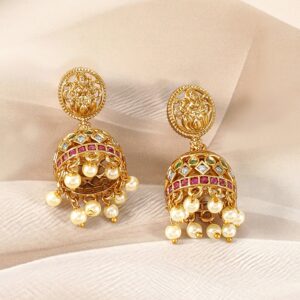 This exquisite 22K gold-plated necklace set by features a stunning Divine Laxmi Temple pendant, adorned with ruby, emerald, and CZ stones, exuding a regal charm. The intricate design is enhanced by delicate pearl drops, adding an elegant touch. Paired with matching jhumkas, this set is perfect for traditional attire, reflecting timeless grace and divine beauty. Material : & Care Dimension : Necklace Length: 22 cm / 5.5 cm Width: 3.3 cm / 1.5 cm Material: Brass Net Weight: 32.32 Gram Net Quantity: 1 Necklace & 1 Pair of Earrings Care Label: It is advisable to avoid contact with water and organic chemicals i.e. perfume sprays. Store jewellery in airtight box. After use, wipe the jewellery with soft cotton cloth.