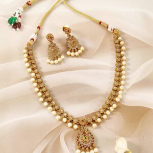 Adorn yourself with this stunning 22K gold-plated jewellery set, featuring an exquisite combination of Ruby and Emerald Kundan stones, complemented by sparkling CZ (Cubic Zirconia) accents. This traditional set is elegantly enhanced with lustrous pearl beads, adding a regal touch to your ethnic attire. The intricately designed necklace and matching earrings are perfect for elevating your style with a blend of sophistication and tradition. Whether for a special celebration or a cultural gathering, this jewelry set is sure to make a statement. Material : & Care Dimension : Necklace Length: 23 cm / 3.8 cm Width 3.4 cm / 1.3 cm Material: Brass Net Weight: 32.13 Gram Net Quantity: 1 Necklace & 1 Pair of Earrings Care Label: It is advisable to avoid contact with water and organic chemicals i.e. perfume sprays. Store jewellery in airtight box. After use, wipe the jewellery with soft cotton cloth.