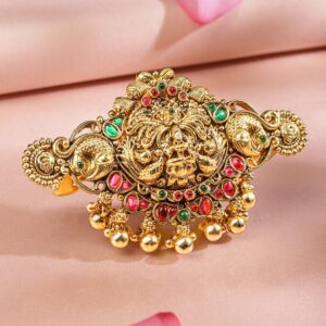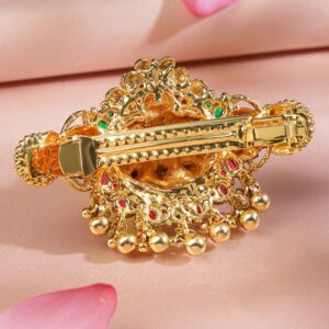 Hair Accessories : This 22K gold-plated temple hair clip features a divine Goddess Lakshmi motif flanked by peacocks, ruby pink and emerald green stones, and hanging gold beads for a rich traditional finish. Occasion : Bring your style to a whole new level with this handcrafted piece of jewellery. When you’re celebrating a special Occasion : – a birthday, wedding, festive or personal milestone – this piece adds that extra something that makes us feel special and looking our best. Material & Care Dimension : Size : Length : 5.5 cm ,Width : 8.5 cm Material : Brass Net Weight : 45.92 Gram Net Quantity : 1 Hair Accessories Care Label : It is advisable to avoid contact with water and organic chemicals i.e. perfume sprays. Store jewellery in airtight box. After use, wipe the jewellery with soft cotton cloth.