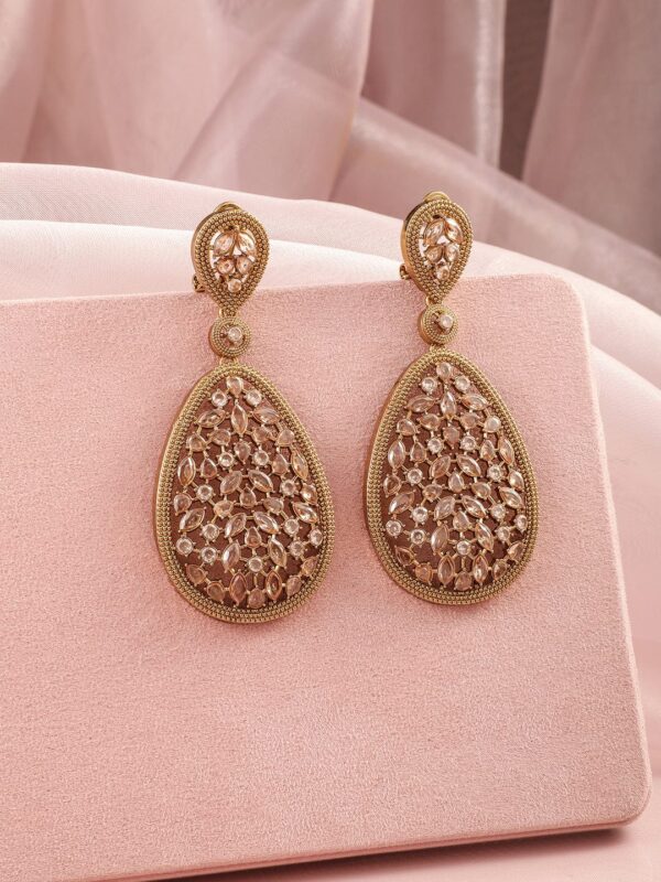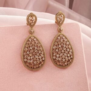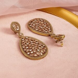 Earrings : These 22K mehandi gold-plated drop earrings are embellished with crystal and zircon stones in a teardrop design, creating an elegant accessory perfect for festive events and grand celebrations. Occasion : Bring your style to a whole new level with this handcrafted piece of jewellery. When you’re celebrating a special Occasion : – a birthday, wedding, or personal milestone – this piece adds that extra something that makes us feel special and looking our best. Material : & Care Dimension : Length : 8 cm, Width: 3.9 cm Net Weight: 38.75 g Net Quantity : 1 Pair Of Earrings Material :Brass Care Label : It is advisable to avoid contact with water and organic chemicals i.e. perfume sprays. Store jewellery in airtight box. After use, wipe the jewellery with soft cotton cloth.