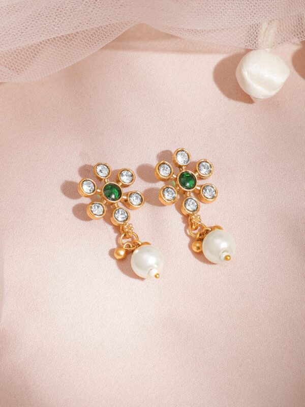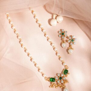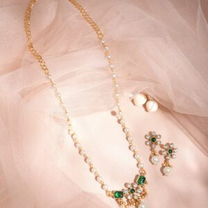 Jewellery Set : This jewellery set consists of a necklace and a pair of earrings Gold-plated necklace has green and white stone-studded and pearl-beaded details Secured with a spring-ring closure A pair of matching drop earrings, each secured with a post-and-back closure Occasion : Bring your style to a whole new level with this handcrafted piece of jewellery. When you’re celebrating a special Occasion : – a birthday, wedding, or personal milestone – this piece adds that extra something that makes us feel special and looking our best. Material : & Care Dimension : Length : 60/3.5, Width: 4.5/1.5 Net Quantity : 1 Necklace & 2 Earrings Net Weight: 23.36 Material :Brass Care Label : It is advisable to avoid contact with water and organic chemicals i.e. perfume sprays. Store jewellery in airtight box. After use, wipe the jewellery with soft cotton cloth.