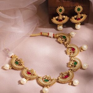 Jewellery Set: One of the most versatile forms of ornate designs that goes well with every style and personality. Wear one of these and you do not have to worry about any other accessory. Occasion : Bring your style to a whole new level with this handcrafted piece of jewellery. When you’re celebrating a special Occasion : – a birthday, wedding, or personal milestone – this piece adds that extra something that makes us feel special and looking our best. Material : & Care Dimension :Size : Necklace : 21 cm, Earrings : 3.5 cm Material: Brass Net Weight: 57.47 Gram Net Quantity: 1 Necklace & 1 Pair of Earrings Care Label: It is advisable to avoid contact with water and organic chemicals i.e. perfume sprays. Store jewellery in airtight box. After use, wipe the jewellery with soft cotton cloth.