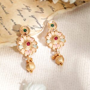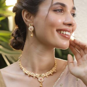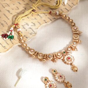 Jewellery Set: One of the most versatile forms of ornate designs that goes well with every style and personality. Wear one of these and you do not have to worry about any other accessory. Occasion : Bring your style to a whole new level with this handcrafted piece of jewellery. When you’re celebrating a special Occasion : – a birthday, wedding, or personal milestone – this piece adds that extra something that makes us feel special and looking our best. Material : & Care Dimension :Size : Necklace : 12 cm Earrings : 2 cm Material :Alloy Care Label : It is advisable to avoid contact with water and organic chemicals i.e. perfume sprays. Store jewellery in airtight box. After use, wipe the jewellery with soft cotton cloth.