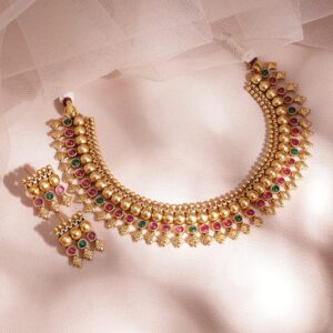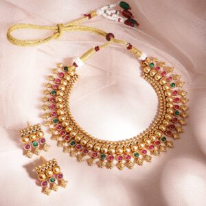 Jewellery Set: One of the most versatile forms of ornate designs that goes well with every style and personality. Wear one of these and you do not have to worry about any other accessory. Occasion : Bring your style to a whole new level with this handcrafted piece of jewellery. When you’re celebrating a special Occasion : – a birthday, wedding, or personal milestone – this piece adds that extra something that makes us feel special and looking our best. Material : & Care Dimension :Size : Necklace : 15 cm, Earrings : 2 cm Material: Brass Net Weight: 30.56 Gram Net Quantity: 1 Necklace & 1 Pair of Earrings Care Label: It is advisable to avoid contact with water and organic chemicals i.e. perfume sprays. Store jewellery in airtight box. After use, wipe the jewellery with soft cotton cloth.