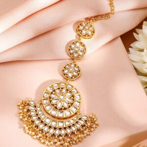 Jewellery Set : Traditional set featuring kundan and pearl-studded handcrafted earrings and maang tikka, perfect for festive celebrations. Occasion : Bring your style to a whole new level with this handcrafted piece of jewellery. When you’re celebrating a special Occasion : – a birthday, wedding, or personal milestone – this piece adds that extra something that makes us feel special and looking our best. Material : & Care Dimension : Length : 8 cm / 5.5 cm, Width: 12 cm / 5.5 cm Net Quantity : 1 Necklace & 2 Earrings Net Weight: 63.30 g Material :Brass Care Label : It is advisable to avoid contact with water and organic chemicals i.e. perfume sprays. Store jewellery in airtight box. After use, wipe the jewellery with soft cotton cloth.