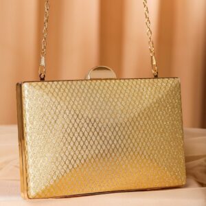 Clutches : Exude elegance with this 24K gold-tone shimmery glossy box clutch, featuring a luxe textured finish, secure clasp closure, and detachable chain strap. A statement piece for evening glamour and special occasions. Occasion : Bring your style to a whole new level with this handcrafted piece of jewellery. When you’re celebrating a special Occasion : – a birthday, wedding, or personal milestone – this piece adds that extra something that makes us feel special and looking our best. Material : & Care Dimension : Length : 12 cm, Width: 5 cm Net Weight: 120 g Net Quantity : 1 Clutches Care Label : It is advisable to avoid contact with water and organic chemicals i.e. perfume sprays. Store jewellery in airtight box. After use, wipe the jewellery with soft cotton cloth.