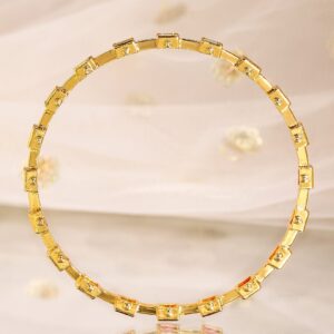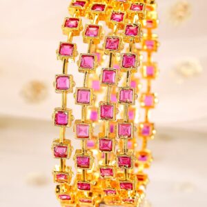 Bangle : This set of 4 handcrafted bangles, 22K gold-plated, features radiant ruby pink square stones, creating a luxurious and striking traditional accessory. Occasion : Bring your style to a whole new level with this handcrafted piece of jewellery. When you’re celebrating a special Occasion : – a birthday, wedding, or personal milestone – this piece adds that extra something that makes us feel special and looking our best. Material : & Care Dimension : Net Weight: 49.58 g Net Quantity: 4 Bangles Material :Brass Care Label : It is advisable to avoid contact with water and organic chemicals i.e. perfume sprays. Store jewellery in airtight box. After use, wipe the jewellery with soft cotton cloth.